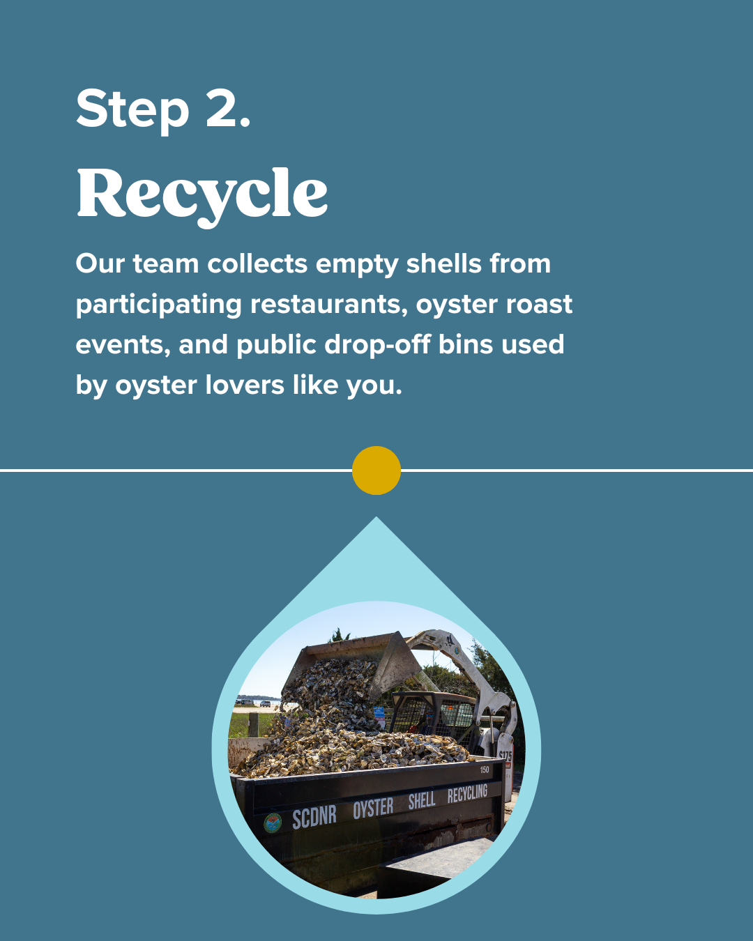 Every oyster you enjoy plays a small but vital role in restoring coastal ecosystems - if its shell gets a second life. In [Your County/City Name Here], shells collected from local restaurants, community events, and drop-off sites are carefully cured to remove any harmful organisms. Once clean and safe, they’re returned to nearby waters to form the foundation of new oyster reefs. These reefs don’t just grow more oysters, they filter water, create habitat for marine life, and help protect shorelines from erosion. It’s a full-circle journey that turns your meal into meaningful restoration right here at home. Recycle your shell at your nearest public dropoff found here.